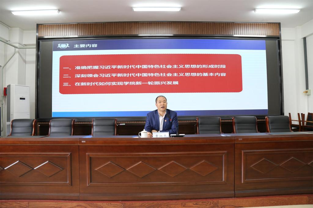 517学院院长曹炳志在办公楼五楼会议室为全院副科级以上干部、基层党组织书记作了题为《在习近平新时代中国特色社会主义思想的指引下,不忘初心,牢记使命,全力实现学院新一轮振兴发展》的专题报告。